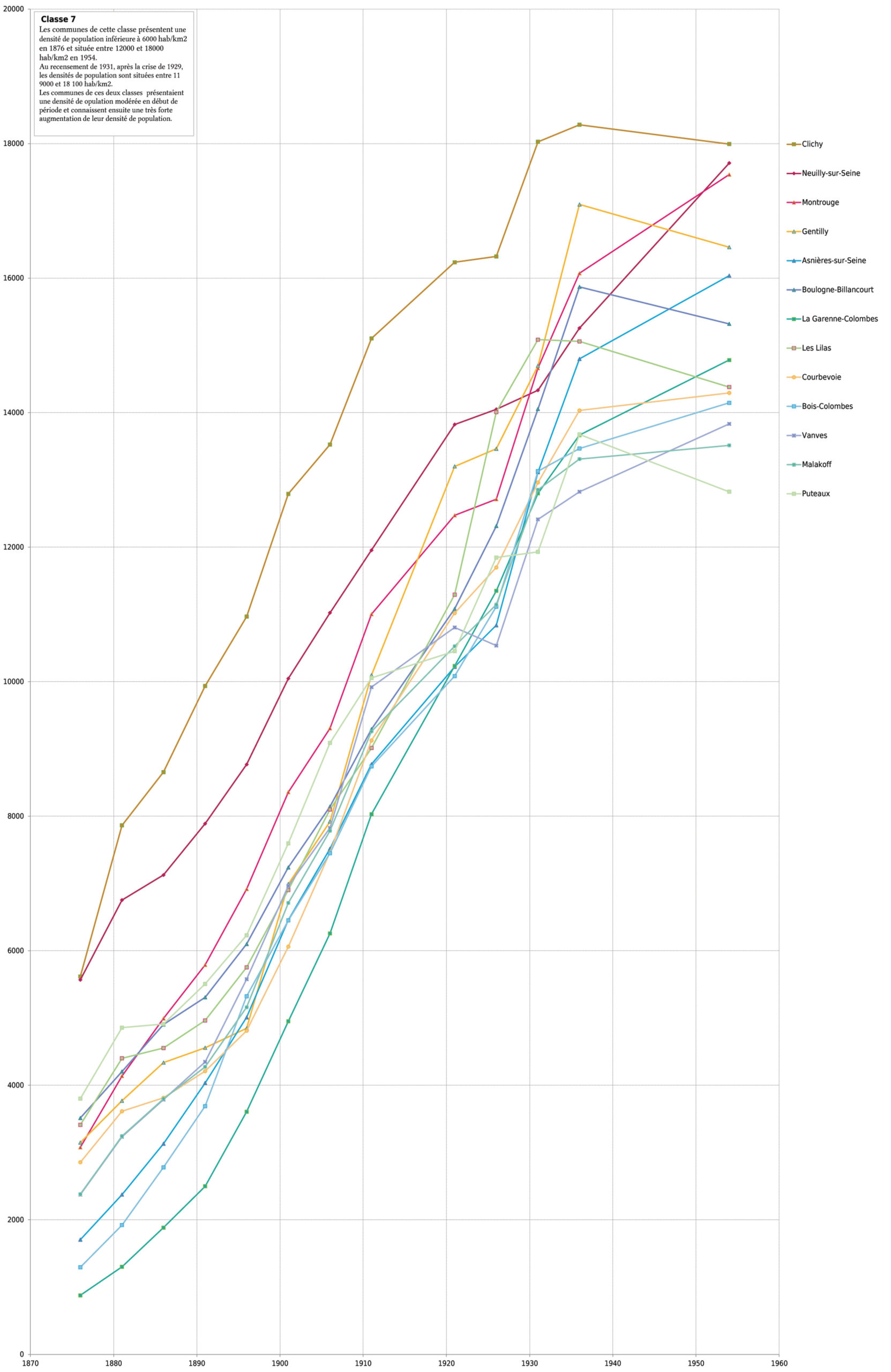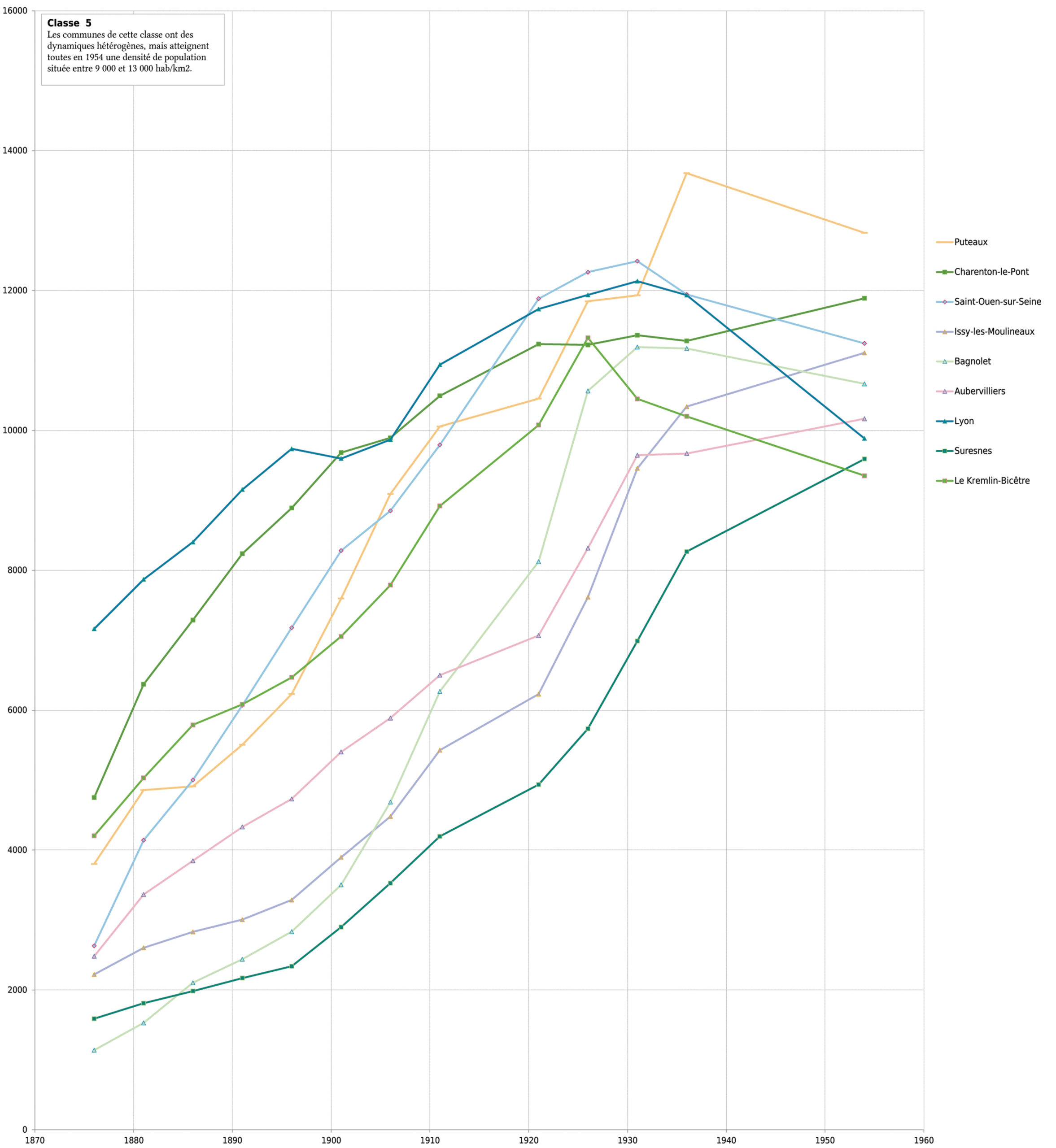 Les dynamiques de croissances de la densité de population des communes atteignant, en 1954, une densité de population supérieure à 4000 habitants/km2 sont très variables. Toutes les communes n’ont pas la même densité de population en 1876 et ne voient pas leur population augmenter au même rythme. Un rupture est perceptible suite à la crise de 1929 (recensement de 1931) : alors que la crise affecte la dynamique d’augmentation de la population de certaines communes, d’autres, au contraire, sont assez peu affectées.
