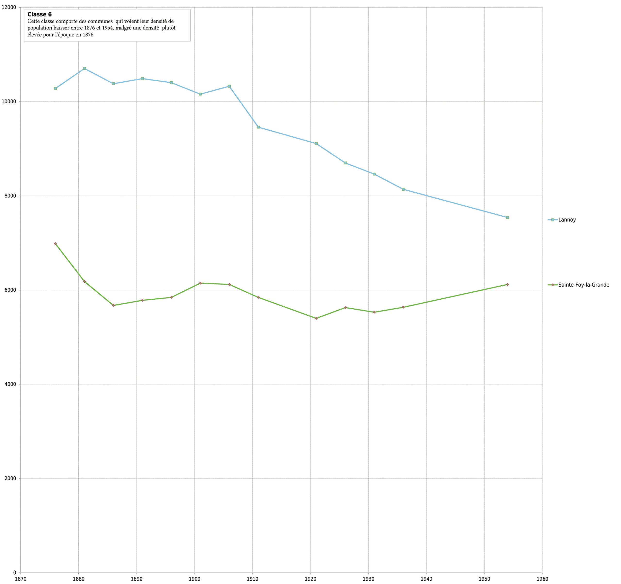 Les communes de cette classe présentent une densité de population légèrement en hausse sur la période. En 1876, elle est située entre 2500 et 6000 hab/km2 et atteint de 4000 à 6000 hab/km2 en 1954.