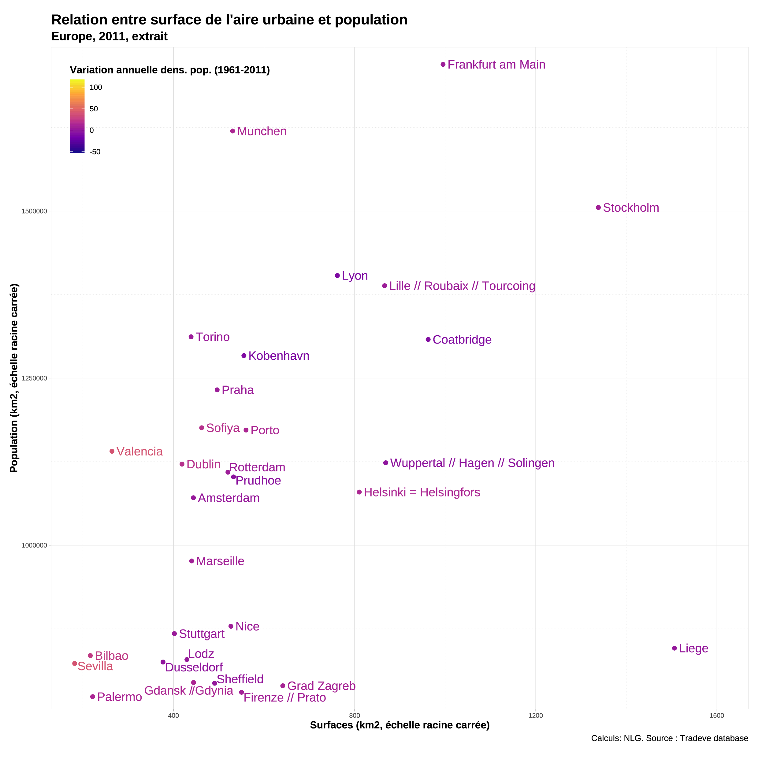 On peut globalement, faire un commentaire similaire concernant les surfaces des unités urbaines européennes, même si le nombre de cas particuliers est moins important.