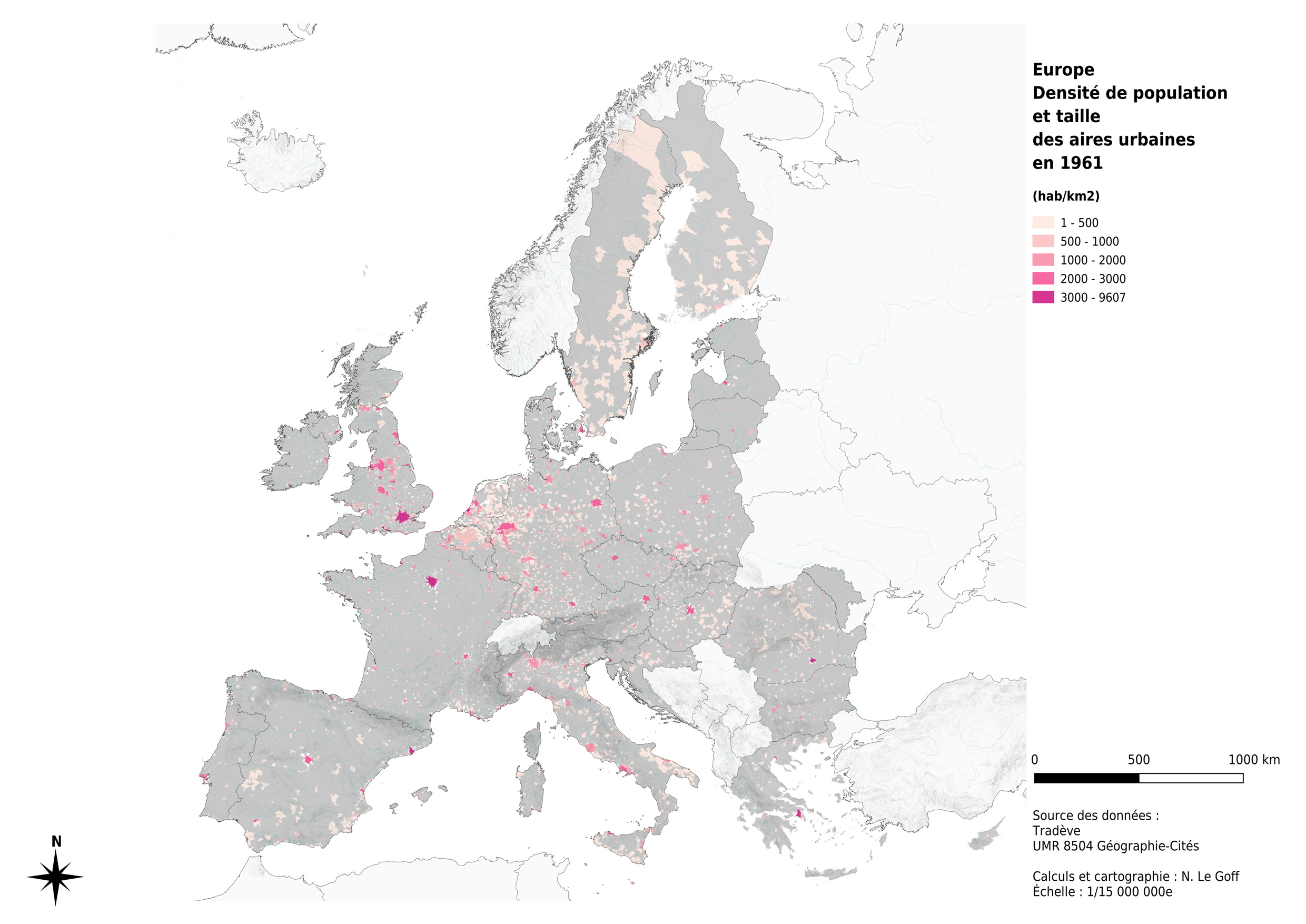 D’autre part, pour saisir les spécificités des grandes métropoles européennes, la série Tradeve a été élaborée par des chercheurs de l’UMR 8504 Géographie-cités. Cette base de données longitudinale repose sur une nouvelle définition des agglomérations urbaines, à partir des données fournies par des agences européennes. Le principal travail de ce projet ANR a consisté à mettre au point et appliquer une protocole rigoureux permettant de déduire des statistiques d’Eurostat des contours géographiques d’agglomérations avec leurs populations associées au fil du temps, entre 1961 et 2011.