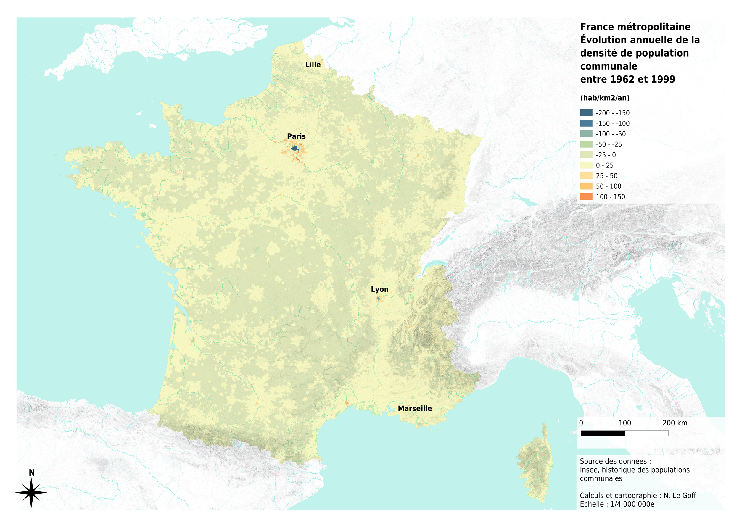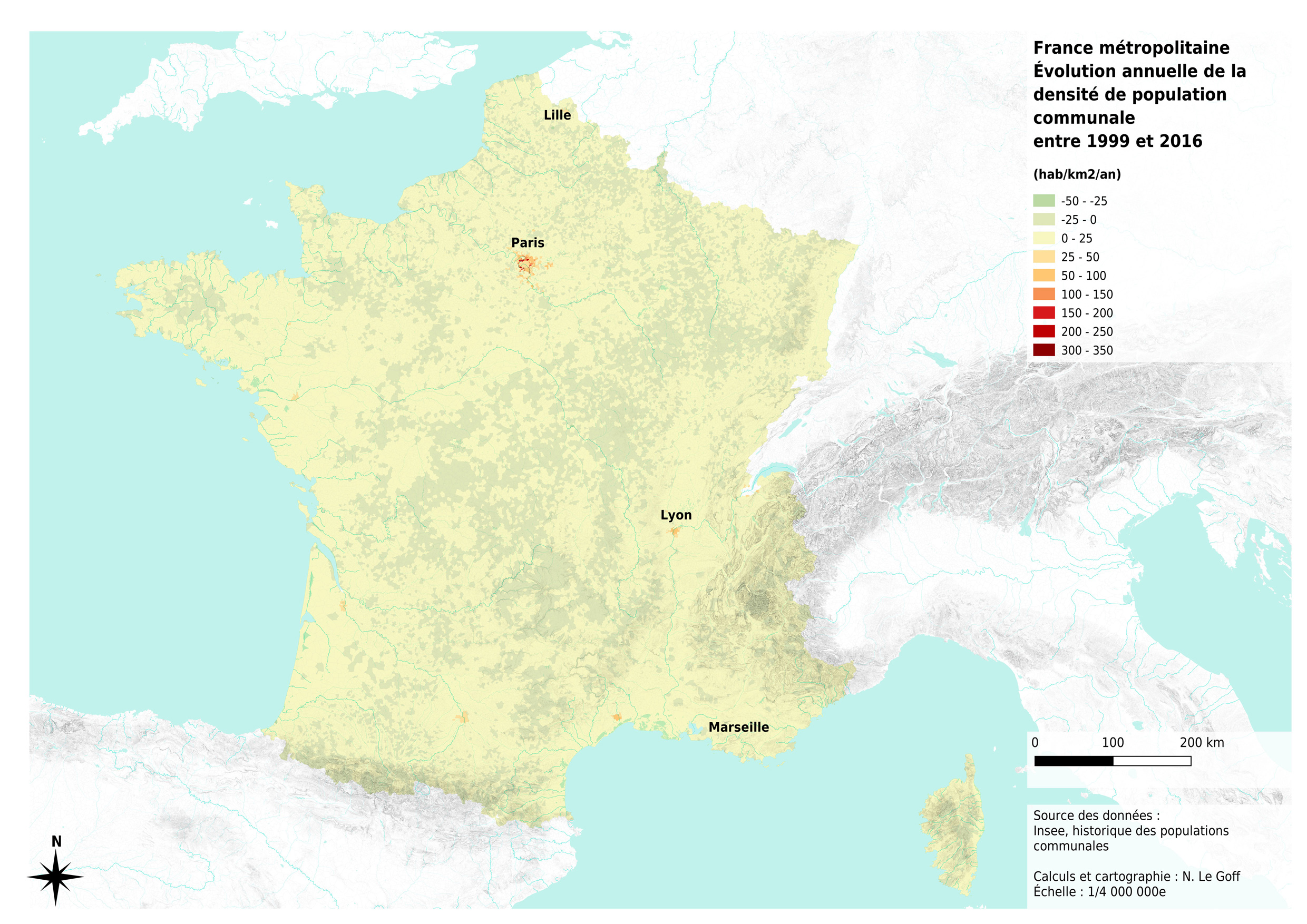 La carte représentant l’ensemble du territoire français montre l’ampleur de l’exode rural vers certains territoires urbains, le littoral, les régions industrielles et certaines vallées fluviales ou alpines. Les quatre plus grandes métropoles françaises connaissent des évolutions différentiées de leur densité de population.