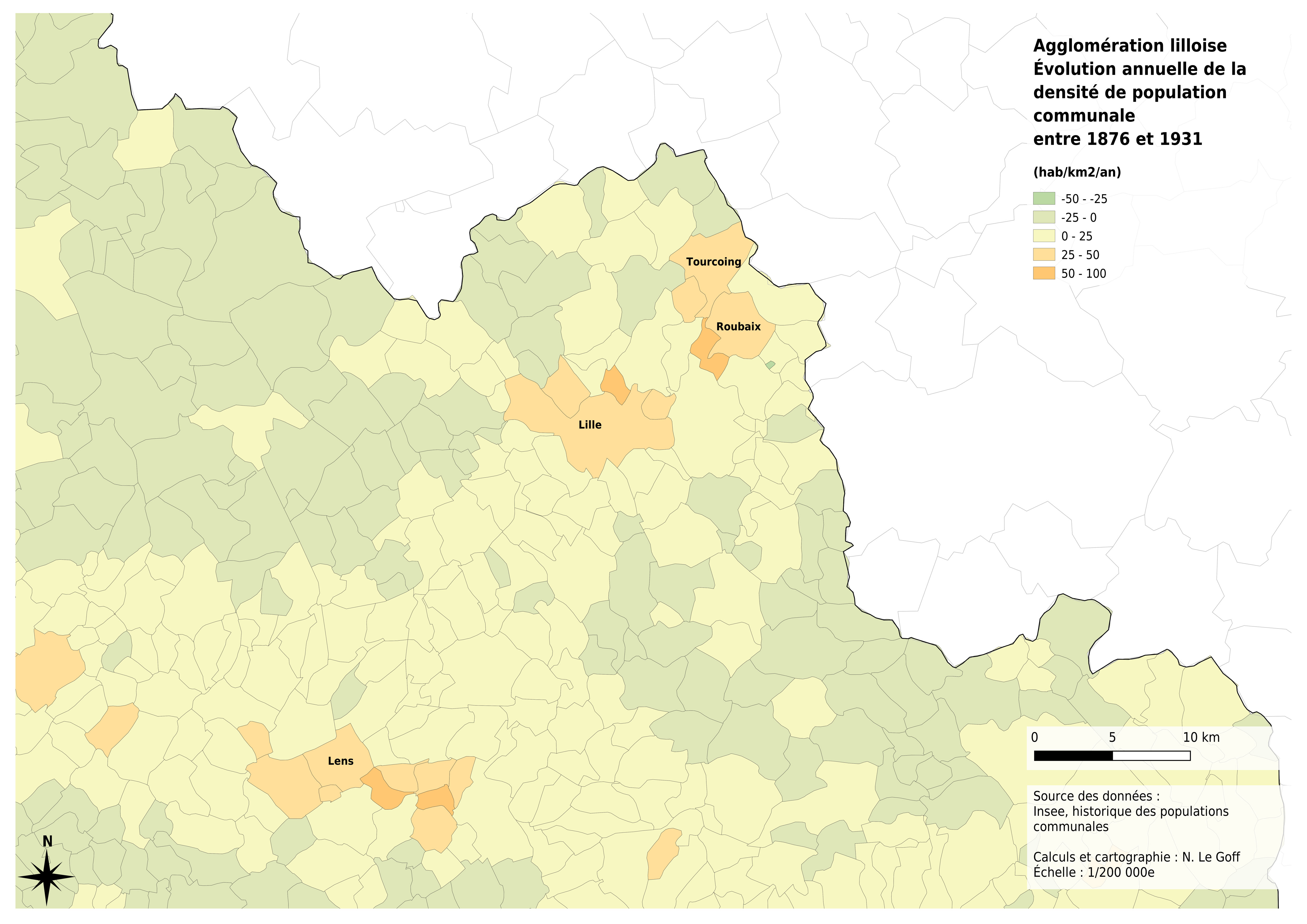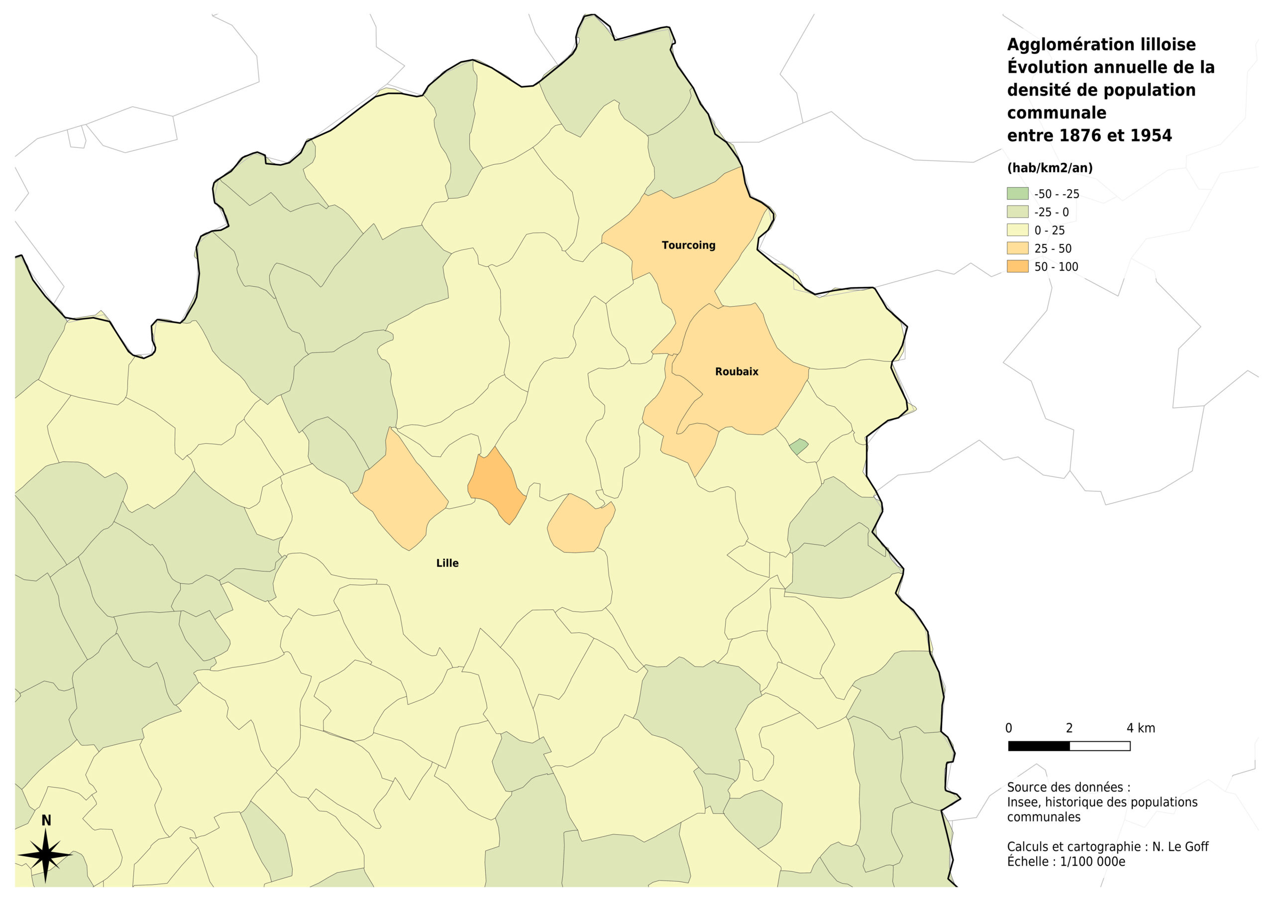 Dans l’agglomération lilloise, les communes à proximité de Roubaix (Croix, Lys-lez-Lannoy) voient aussi leur densité de population s’infléchir à partir de 1931.