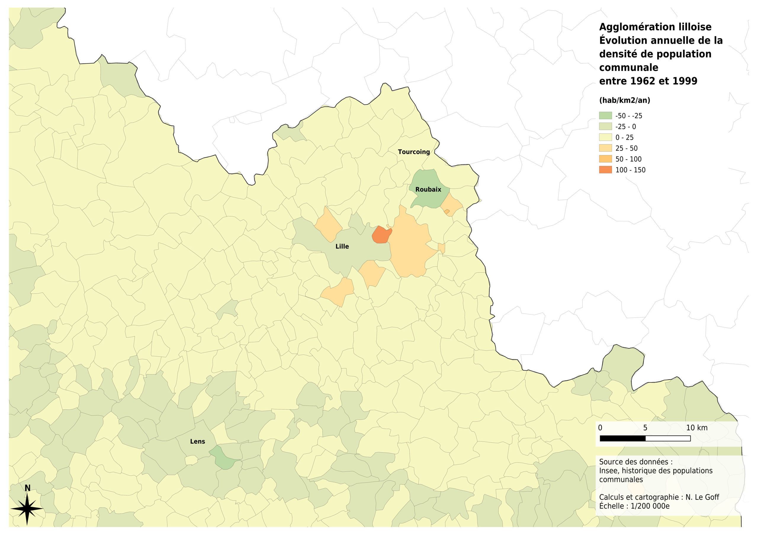 La cartographie confirme le mode de développement polycentrique de l’agglomération lilloise, en lien avec le sud de la Belgique, et le bassin minier de Lens. Les communes sont, le plus souvent, de petite taille, ce qui permet d’analyser assez finement les augmentations de leurs densités de population.