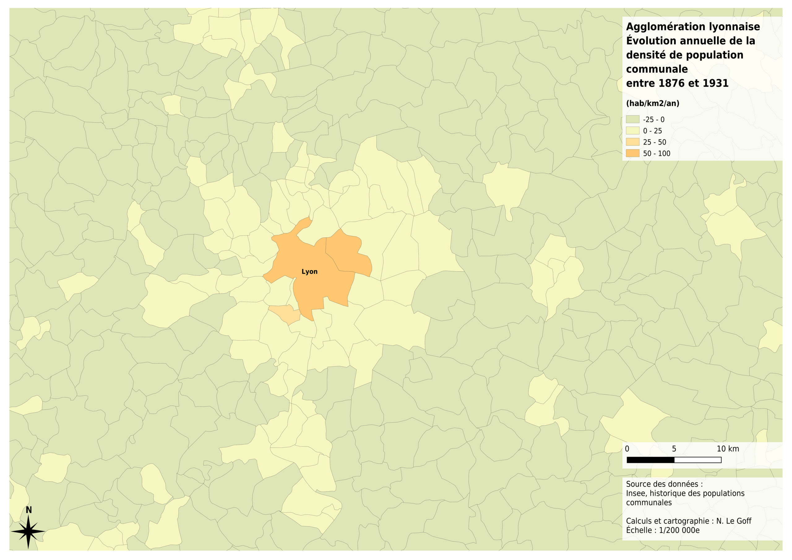 L’agglomération lyonnaise a un développement plutôt centralisé. En cela, il se rapproche du mode d’extension de la métropole parisienne, même si les densités de population et les tailles des agglomérations sont sans commune mesure. Il est cependant à comprendre en lien avec la densification progressive de la vallée du Rhône sur la même période. On le voit, Villeurbanne, bien moins dense que Lyon en début de période, est la commune qui connaît la plus forte augmentation annuelle de sa population jusqu’en 1954.