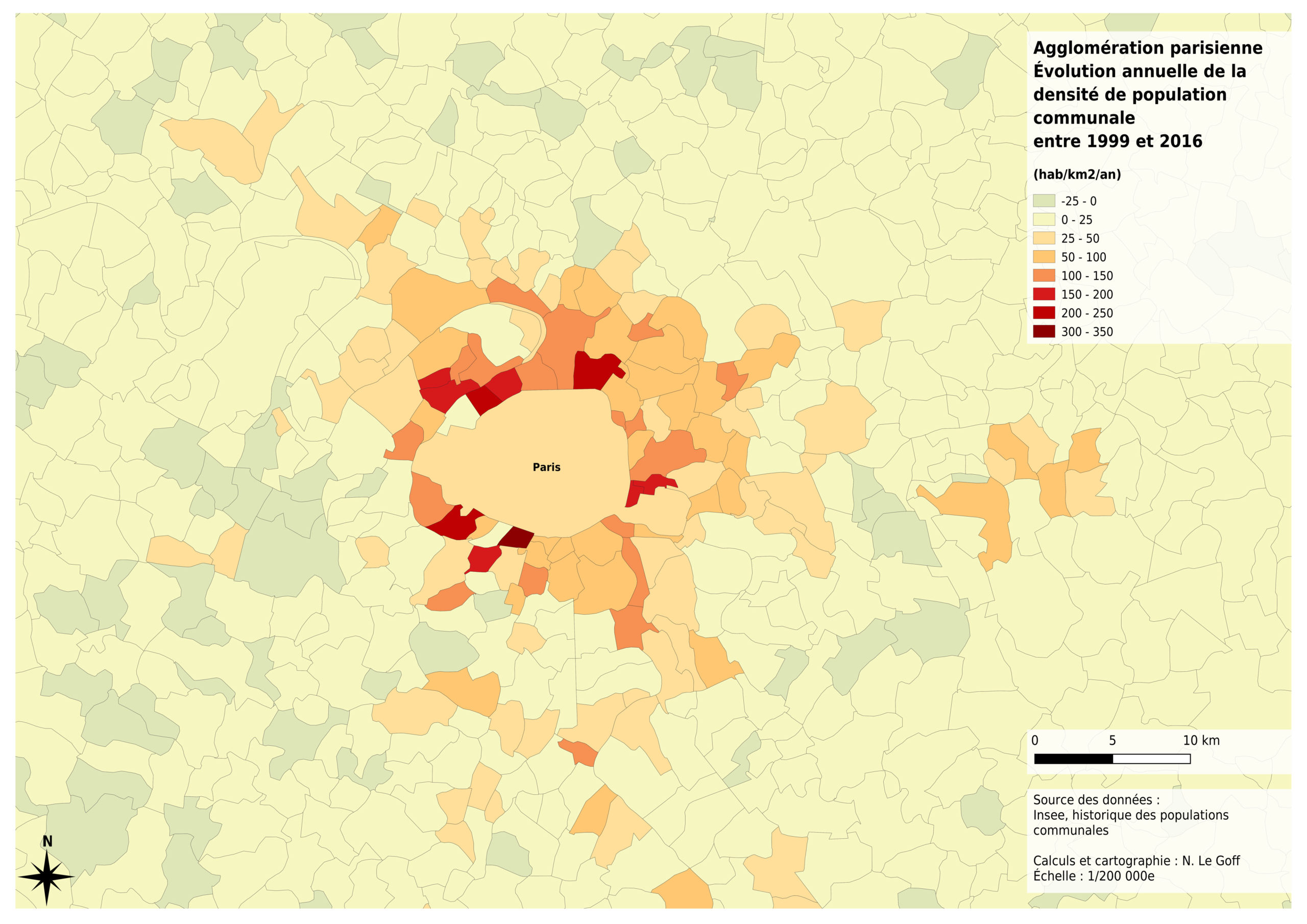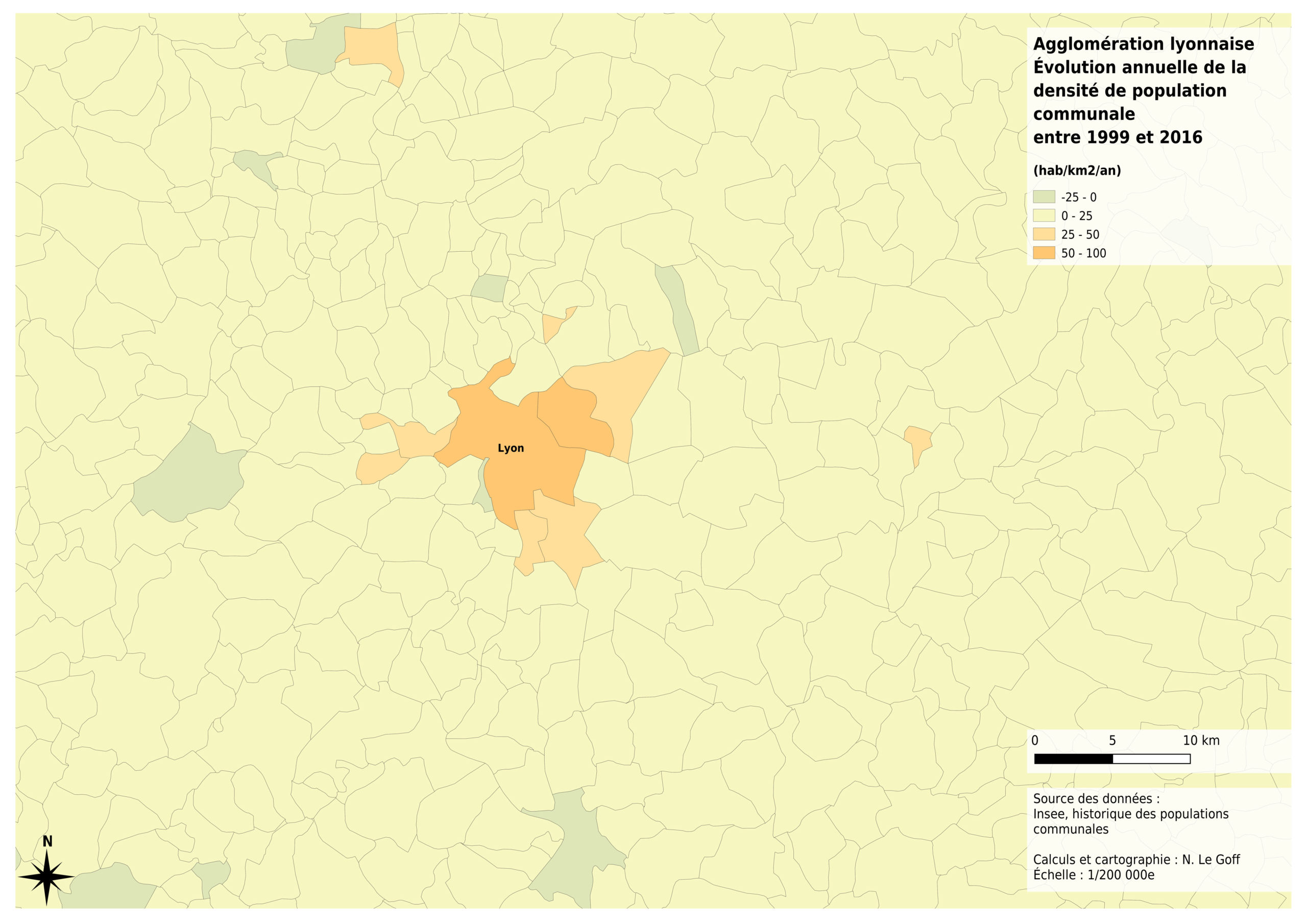 Les périodes considérées n’étant pas de même durée, nous avons aussi cartographié les évolutions annuelles des densités de populations afin de comparer ce qui est comparable.