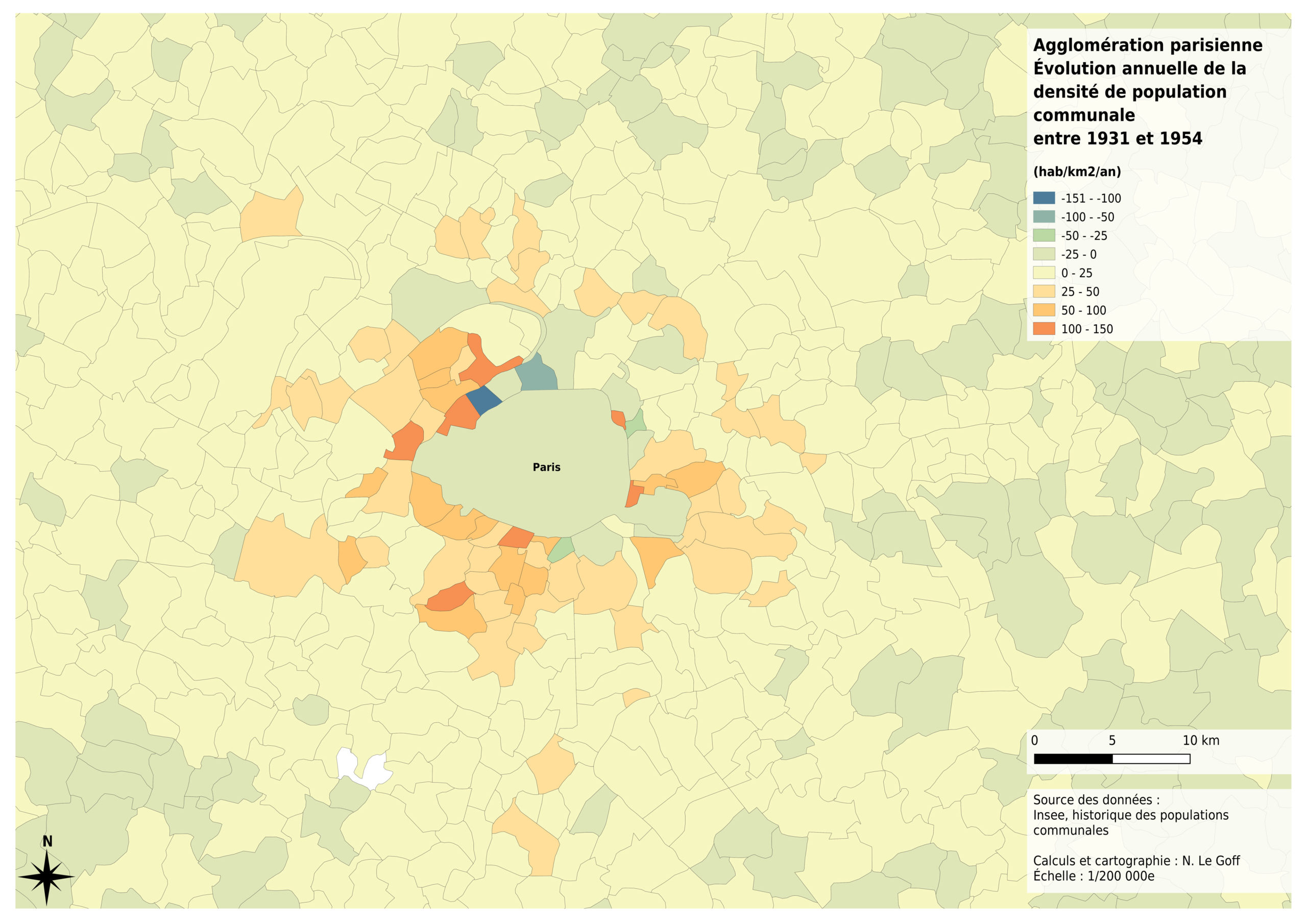 La distribution est relativement continue entre Paris, très densément peuplée et des communes beaucoup moins denses . Et le gradient de leur variation de densité annuelle de population montre que se produit sur entre 1876 et 1954 une différentiation très forte des densités communales au sein de cette aire urbaine.