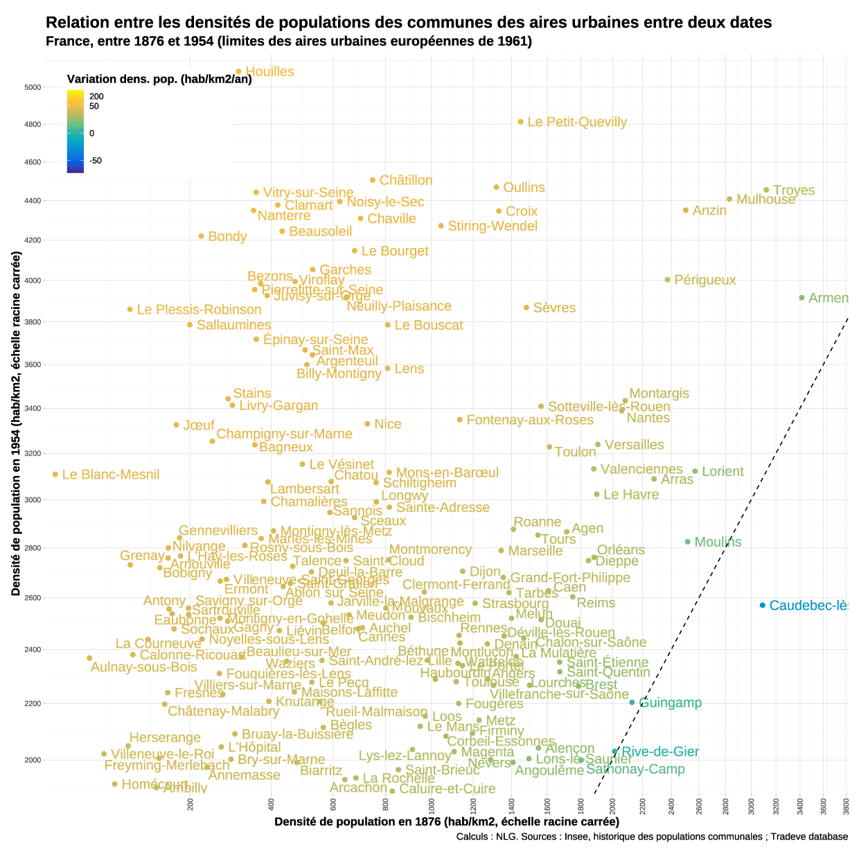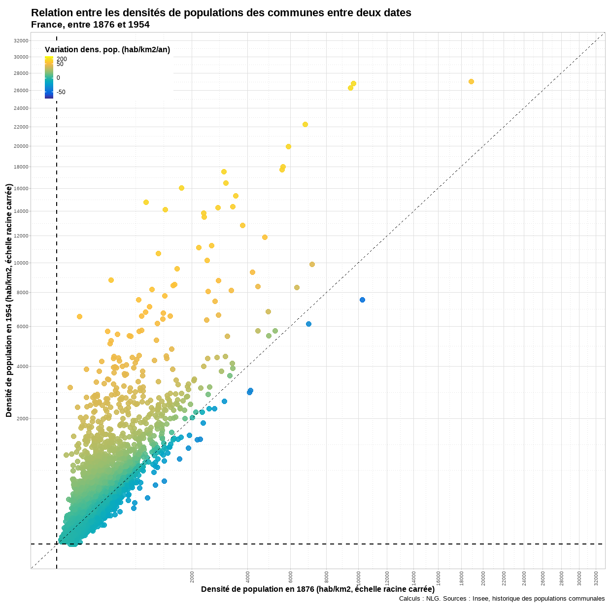 L’ensemble des communes situées sous la diagonale de ce graphique voient leur densité de population baisser, alors celles situées au dessus voient au contraire celle-ci progresser. La couleur permet d’appréhender visuellement la variation annuelle de densité entre 1876 et 1954.