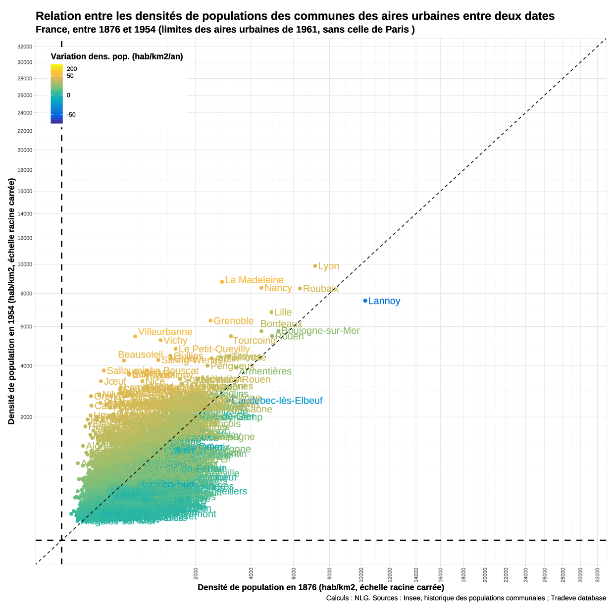 Lyon, qui était deuxième en 1876, arrive en première position en 1954 dans ce groupe. On compte aussi Nancy, Lille, Roubaix et Tourcoing, Bordeaux, Grenoble, Vichy ou Boulogne-sur-Mer parmi les communes les plus denses, suivies par Troyes, Mulhouse, Périgueux puis Lens. Mais l’augmentation de leur densité varie selon leur situation initiale.