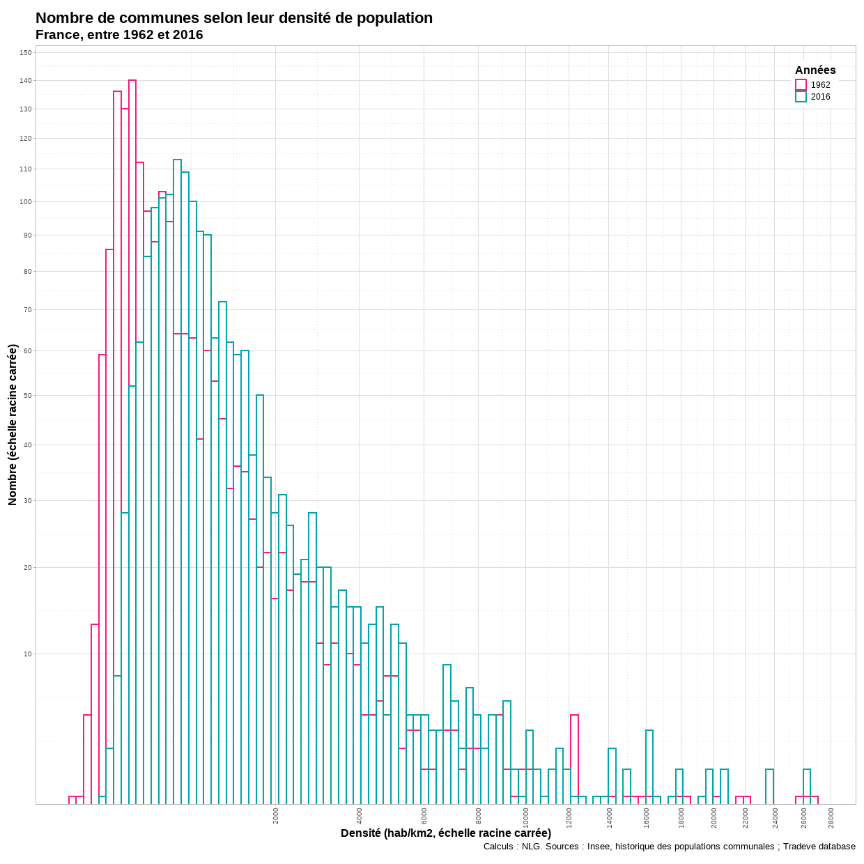Puisque la croissance urbaine est un des enjeux qui nous intéressent, nous avons choisi de nous pencher sur dynamiques des densités des populations des communes françaises sur le temps long. S’il n’y a pas de relation de cause à effet directe entre ces augmentations de densités et les tissus urbains qui se constituent au fil du temps, la comparaison des évolutions de densités de populations communales, permet, a minima, de comparer des territoires qui ont eu à faire face à des problématiques démographiques comparables.