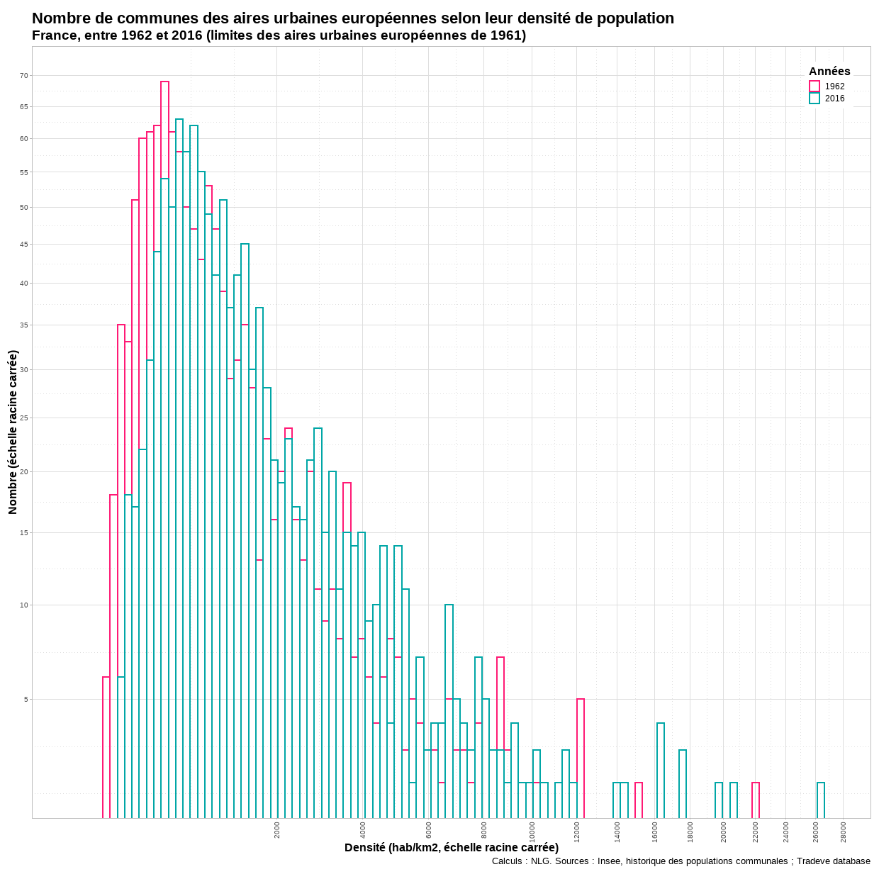 Ainsi, entre 1962 et 2016, la densité de population est en forte augmentation pour au moins un quart des communes, dont la population en 1962 est comprise entre 360 et 770 habitants en début de période, pour finir entre 450 et 1420 habitants en fin de période. Il faudrait analyser s’il y a là une indication d’un nouveau mode d’urbanisation.