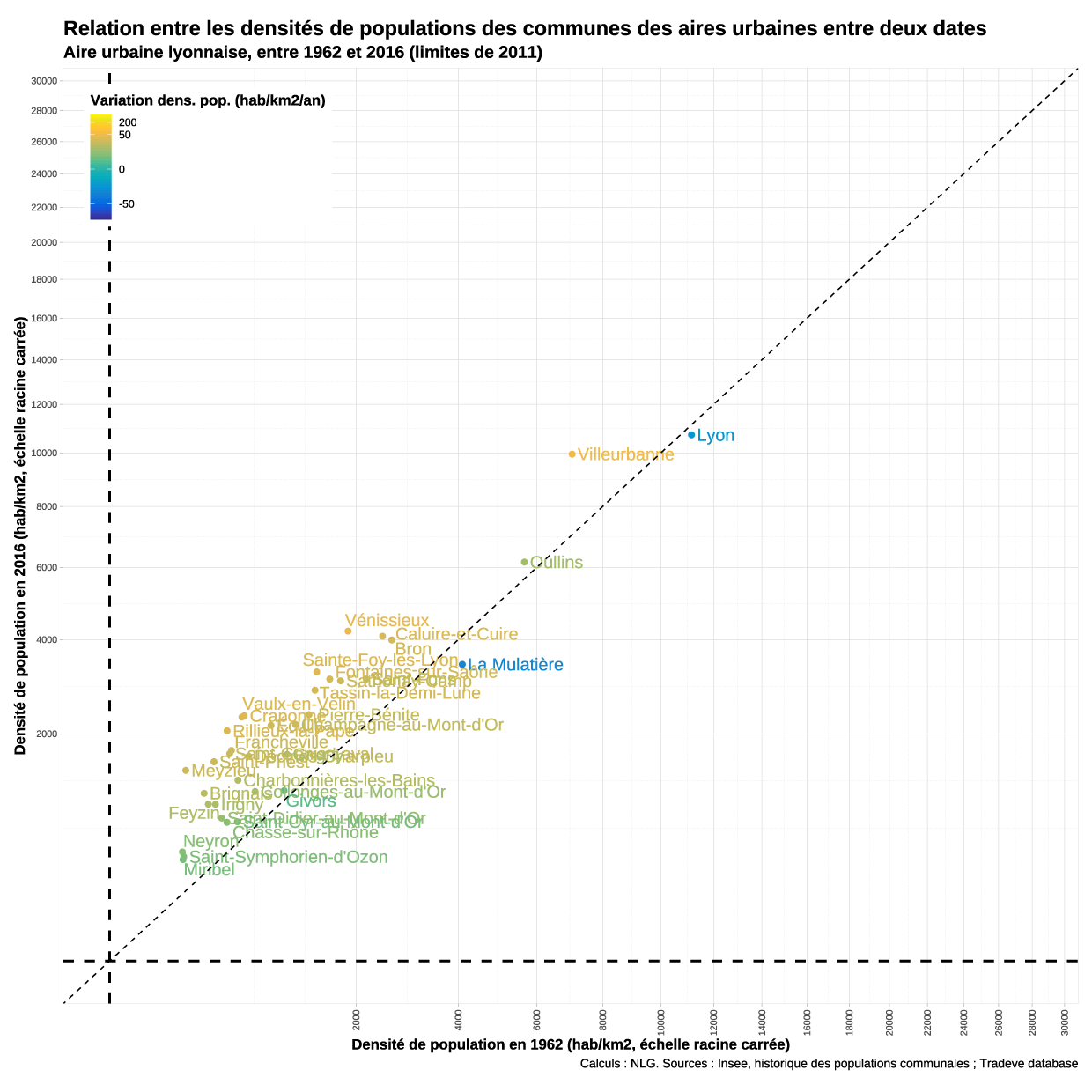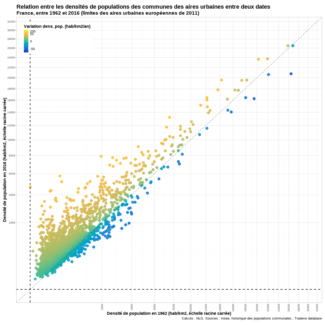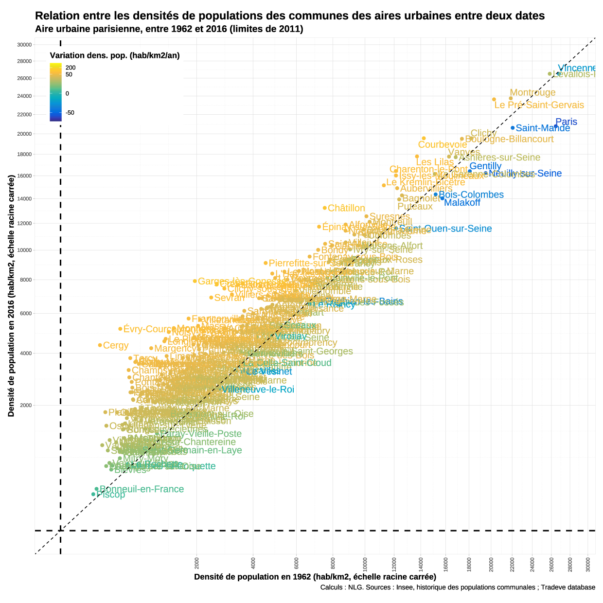 La visualisation des noms des communes dans la distribution des évolutions de densité de populations communales dans les unités urbaines met en évidence des phénomènes intéressants : la dynamique de grandes communes françaises est comparable à celle de certaines communes de la périphérie parisienne. Celles-ci sont d’ailleurs très majoritaires dans le haut de la distribution des densités en 1954. Certaines d’entre-elles connaissent aussi les plus haute augmentation de densité de population sur la période concernée. Il convient donc de distinguer les communes de l’aire urbaine parisienne des autres, afin de rendre les dynamiques plus lisibles.