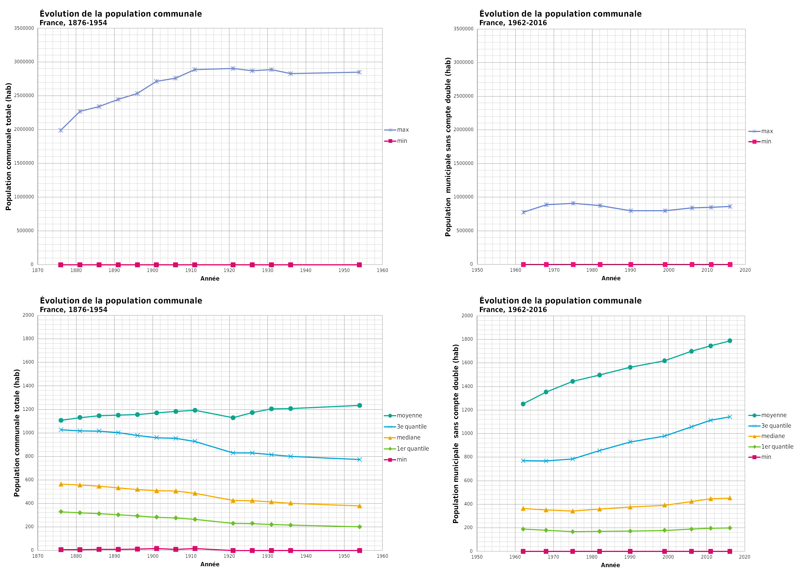 La série 1962-2016 permet de mettre en évidence deux phénomènes : d’une part une tendance à l’augmentation de la population de Paris jusqu’en 1975, avant qu’elle ne reflue puis ne se stabilise; d’autre part une augmentation de la moyenne des populations communales françaises, qui semble tirée par des communes les plus peuplées en dehors de Paris. La population des communes du troisième quartile augmente fortement et dans le même temps, celles du premier quartile ont une démographie stagnante, tandis que la population des communes du deuxième quartile n’augmente que légèrement.